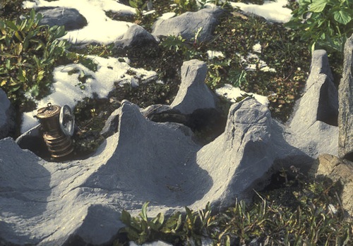 Dezaiko PlateauLooking closer at karst landscapes one finds smaller features, sometimes called surface karst. These take on a variety of shapes and sizes, but all are caused by water. Sometimes their shaping occurs on exposed surfaces, sometimes under mantles of soil. As water dissolves pockets or channels in the rock, these in turn serve as collection points for more water, resulting in deepening of channels while leaving the high-points relatively untouched. Small channel features caused by rainwater or snowmelt are called karren, of which there are several types, including the classic rillenkarren which forms miniature mountain-ridges and valleys on sloped surfaces.